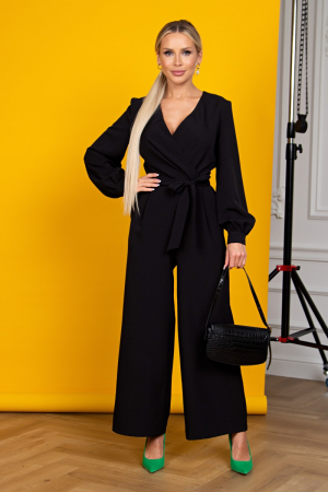 Стильный и удобный комбинезон. V - образная горловина с эффектным запахом до талии. Длинный втачной рукав на манжете. Широкие брюки прямого, свободного силуэта длинной 7/8. По бокам функциональные карманы. По спинке застежка на потайную молнию. Тканевый пояс дополнительно подчеркнет линию талии.