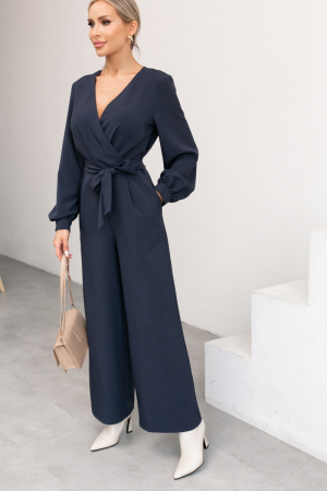 Стильный и удобный комбинезон. V - образная горловина с эффектным запахом до талии. Длинный втачной рукав на манжете. Широкие брюки прямого, свободного силуэта длинной 7/8. По бокам функциональные карманы. По спинке застежка на потайную молнию. Тканевый пояс дополнительно подчеркнет линию талии.