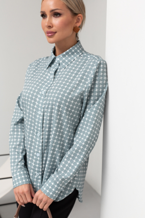 Стильная рубашка прямого силуэта с оригинальным принтом. Длинные втачные рукава оканчиваются манжетами с застежкой на пуговицу. Горловина оформлена классическим воротником на стойке, переходящим в планку с застежкой на пуговицы. Спинка дополнена кокеткой со складкой. Низ фигурный, без разрезов. Рубашка отлично смотрится как заправленная, так и на выпуск.