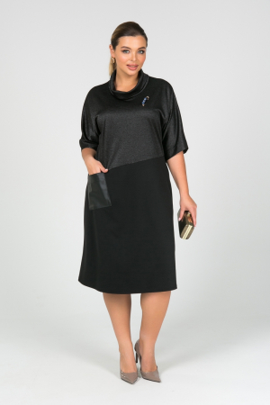 Красивое платье прямого силуэта из однотонного трикотажного полотна и трикотажа с люрексом. Цельнокроеный короткий рукав. Горловина оформлена воротником - хомут. Модель с ассиметричным срезом по линии талии. Перед дополнен накладным карманом из эко - кожи. Низ ровный, без разрезов. Модель прекрасно дополнит ваш гардероб.