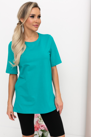Футболка прямого силуэта из однотонного трикотажного полотна. Круглый вырез горловины. Короткие втачные рукава. Низ ровный, по бокам разрезы. Идеальный вариант на каждый день.