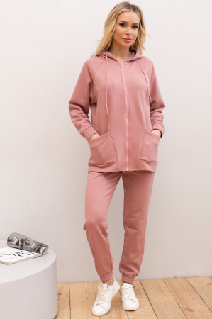 Стильный костюм из трикотажного полотна "футер" состоит из брюк и толстовки. Брюки с комфортной посадкой на талии, которую обеспечивает пояс на резинке, по бокам функциональные карманы. Брючины оканчиваются притачными манжетами на резинке. Толстовка прямого кроя, длинный рукав - реглан оканчивается притачной манжетой. По переду застежка на молнию, по бокам накладные карманы. Модель с капюшоном. Низ ровный с притачной манжетой.