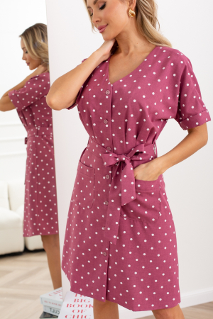 Стильное платье полуприлегающего силуэта. V-образный вырез горловины переходит в планку с застежкой на пуговицы. Цельнокроенные короткие рукава на манжетах с отворотами. Модель отрезная по линии талии, по спинке собрана на резинку. По переду выполнены защипы. Модель дополнена функциональными накладными карманами. Низ ровный, без разреза. Талию идеально подчеркивает пояс, завязывающийся в элегантный бант.