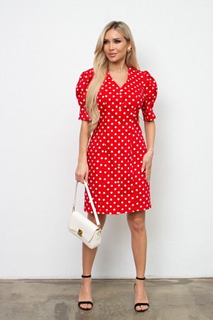 Красивое платье прилегающего силуэта. V - образная горловина на внутренней обтачке. По переду застежка на петли и пуговицы. Короткий Втачной рукав - фонарик. Низ ровный, без разрезов.