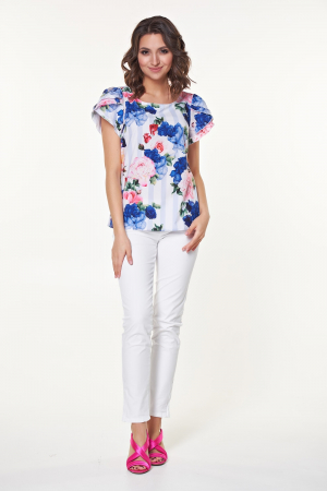 Очаровательная блуза прямого силуэта из легкого полотна с цветочным принтом. Короткие рукава-крылышки с защипами по окату добавят нежности Вашему образу. Округлая горловина на внутренней обтачке. Низ прямой, без разрезов. Универсальная блузка, которая будет хорошо сочетаться как с брюками, так и с юбкой.