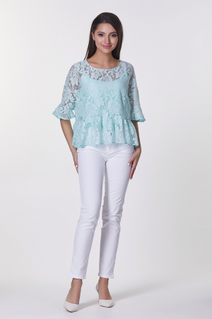 Нежная блуза-двойка станет отличным вариантом для праздничного выхода. Верх представлен очаровательной кофтой из гипюра, низ которой дополнен втачной оборкой. Низ блузки оформлен легким топом полуприлегающего силуэта на бретельках. Круглая горловина на обтачке, короткий спущенный рукав дополненный воланом . В среднем шве спинки заложена застежка на петли и пуговицы. Блуза добавит образу легкости и воздушности.