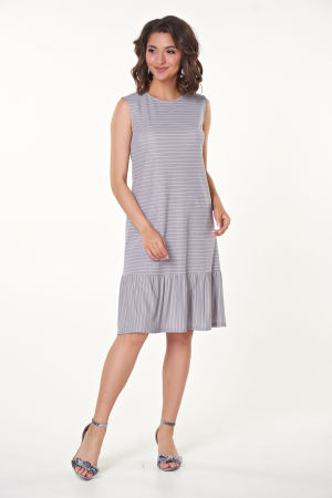 Нежное платье прямого силуэта из полотна в контрастную полоску. Круглая горловина и пройма на обтачке. В среднем шве спинки расположен разрез с застежкой на пуговицу. Низ ровный, дополнен широким воланом.