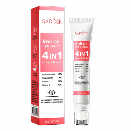 SADOER представляет роликовый крем для кожи вокруг глаз 4 в 1. Формула крема обогащена гиалуроновой кислотой (10%). Никотинамид (5%) также входит в состав крема. Ретинол присутствует в концентрации 30%. Витамин C составляет 10% от состава. Крем предназначен для укрепления и питания кожи.