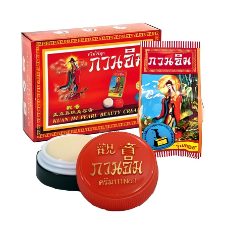 Отбеливающий крем Kuan Im с частицами жемчуга призван отбеливать веснушки, меланиновые пятна, устранять акне, бороться с угревой сыпью.