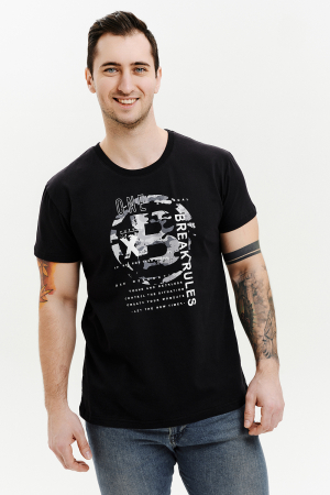 Футболка прямая, свободная, средней длины, с округлой горловиной. Рукав короткий. Горловина обработана эластичной обтачкой.