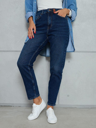 Женские ретро джинсы с пятью карманами. Посадка Mom fit (высокая талия), свободные в бедре и зауженные к низу, укороченной длины. Застежка на молнию. Выполнены из слабоэластичной ткани denim comfort stretch. Темная стирка с потёртостями и "усами" спереди и потёртостями сзади.