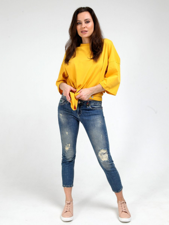 3Женские модные джинсы с пятью карманами. Посадка Skinny boyfriend fit, свободные в бедре и зауженные книзу, укороченные (внутренний шов - 67 см). Для улучшения посадки сделан подкройной пояс из 2-х частей. Застежка на молнию. Низкая высота посадки по талии. Оригинальная средняя стирка с дополнительным оттенком (тинт), с потёртостями и заломами. Спереди несколько растрепанных дырок, создающих модный эффект поношенности. Выполнены из слабоэластичной ткани denim comfort stretch . Модная фурнитура ограниченной серии. Параметры указаны для размера 28.