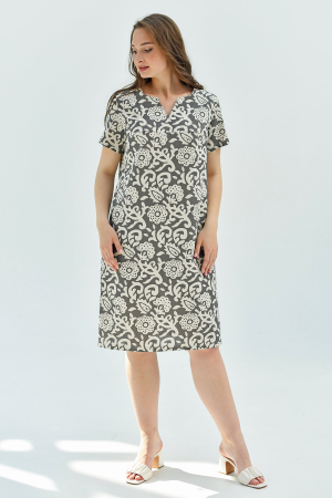 Платье женское из набивной ткани : лён и хлопок. Изделие прямого силуэта базового покроя, с втачным коротким рукавом, без застёжки, длиной до колена. В боковых швах карманы.