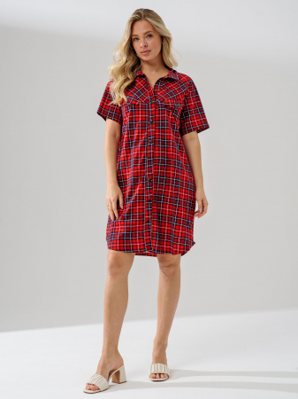 Халат женский на планках и застежкой на пуговицы, с двумя боковыми карманами. Полочка с кокетками и клапанами на пуговицах. Воротник отложной. Рукав втачной, короткий. Низ изделия фигурный.