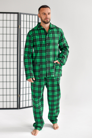 Мужская пижама прямого силуэта из хлопчатобумажной ткани – фланель. Это мягкий, приятный на ощупь материал, прекрасно подойдет для сна и домашнего отдыха . Пижама состоит из рубашки и брюк . Рубашка с длинными рукавами, накладными карманами , отложным воротником. Брюки прямые с боковыми карманами.