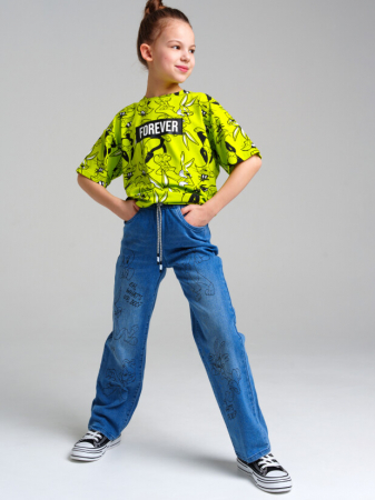 Джинсы для девочки. Эластичный пояс со шнурком. Крой Wide leg ? это свободная посадка и расклёшенные от бедра штанины. Высокая посадка.