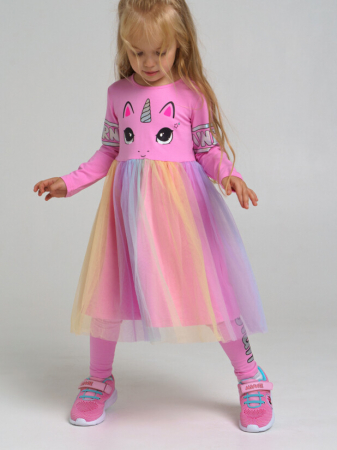 Платье трикотажное с длинным рукавом. Размер изделия на фото - 110, параметры модели (см): рост 104,5, обхват груди-талии-бедер: 53,5-57-53,5. Высокое содержание хлопка 95%. Благодаря наличию эластана в составе ткани изделие держит форму и меньше мнется. Верхняя юбка из сетки с градиентом.