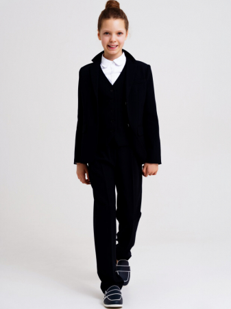 Школьный синий классический костюм - это главный деловой атрибут любой школьницы. Классический костюм для девочки подростка отлично подойдет в школу на каждый день и для торжественных мероприятий. Именно таким и должен быть современный костюм для школы - элегантный, качественный, красивый и практичный. Костюм для школы выполнен из ткани non-iron, которая не требует глажки после стирки. Пиджак приталенного силуэта на подкладке. Школьные прямые брюки с дополнительной утяжкой обеспечивают комфортную посадку по фигуре. Удобные карманы в боковых швах. Застежка на молнию и пуговицу.