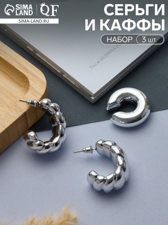 Серьги и каффы QF «Плетённый бублик», набор, цвет серебро (арт. 10826333)