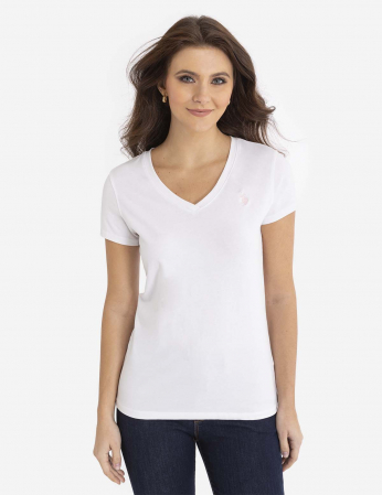 The V-Neck Tee Shirt from U.S. Polo Assn. delivers everyday ease with a modern V-neck silhouette. Made from a soft cotton blend, this tee features a ribbed V-shaped neckline and short sleeves. A large stitched U.S. Polo Assn. logo sits on the left upper chest for a signature branded look. It sits just below the waist and offers easy care—perfect for casual wear and effortless styling. Model wearing a size small.
