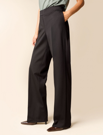 Прямые брюки выполнены из плотного трикотажа джерси. Модель дополнена боковыми карманами. Посадка на талии фиксируется эластичным поясом на резинке. Заутюженные стрелки визуально вытягивают силуэт. Изделие хорошо держит форму и почти не мнется во время использования.