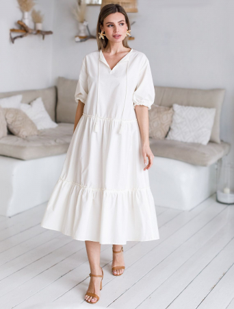 Платье с V-вырезом выполнено из легкого хлопкового поплина. Воздушная модель с пышной юбкой-воланами в стиле бохо отличный вариант для жаркой погоды. Натуральный состав ткани обладает высокой воздухопроницаемостью, а также способностью поглощать и отдавать влагу. В изделии будет очень комфортно, благодаря правильной регуляции температуры тела. Подходит для любой фигуры.