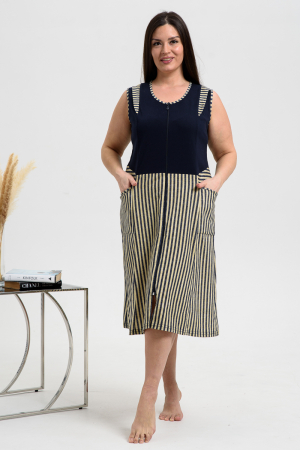 Халат на молнии, полуприталенного силуэта, без рукава, с округлой горловиной, длиной ниже колена, с боковыми карманами. Полочка и спинка с вертикальными рельефами. Верхняя часть халата выполнена из отделочного полотна. Горловина, проймы и карманы обработаны бейкой из основного полотна.