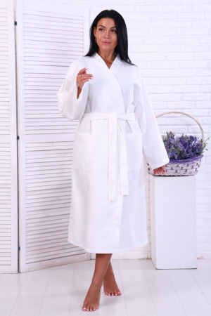 Вафельный халат- кимоно отельный. Рукав длинный. Карманы накладные. Воротник планка. Плотность вафельного полотна 225 гр.
