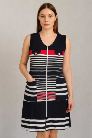 Халат женский без рукавов на молнии. Два накладных кармана по бокам, свободный крой без пояса. Декоративные пуговицы спереди. Модель выполнена из 100% хлопка.