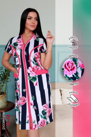 Женский халат средней длины на молнии, с красивым принтом на ткани в виде полос и роз. Общая длина приблизительно до коленей.
