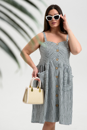 Сарафан женский на широких бретелях, отрезной по линии талии. Застежка на петли -пуговицы. В верхней части полочки и спинки рельефы. Нижняя часть сарафана имеет небольшую сборку по шву притачивания, два накладных кармана. Сарафан смотрится оригинально за счет подбора полосы в деталях под разным углом.