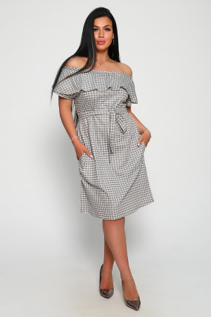 Женское платье - сарафан полуприлегающего силуэта с поясом и широкой рюшью на плечах. Выполнен в романтическом стиле из трикотажного полотна, 100% хлопок. Горловина собрана на резинку и отделана широкой оборкой. Короткий рукав, реглан. Длина пояса в 44 размере 155 см, в 62 размере 180 см. Широкий размерный ряд с 44 до 62 размера. Яркие весенне-летние расцветки с принтом по ткани в виде клетки. Карманы в боковом шве, добавляют дополнительный комфорт при носке. Платье можно носить, как со спущенным с плеч верхом, так и с поднятым, либо на одно плечо. Прекрасно подходит беременным, так как пояс не фиксируется на изделии и может приталить платье на любом уровне. В этом нарядном и удобном платье, Вы будете себя чувствовать комфортно в любой обстановке: на прогулке, дома, в отпуске, на пляже, на даче и на любом празднике.