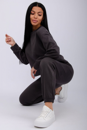 Удобный костюм для повседневной носки и активного отдыха и выхода в свет. Варианты цветов вас приятно удивят: глубокий черный, шоколадный коричневый, серый графит и милый молочный. Верх: джемпер с манжетами на рукавах, низ: прямые брюки на резинке. Приятная фактурная ткань с объёмным геометрическим узором придаст элегантность вашему образу. Костюм легко комбинировать с кроссовками и ботинками. Отличный выбор для осени и зимы.