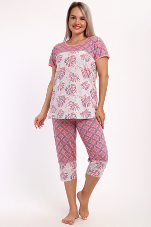 Кофта свободного покроя со спущенной проймой, бейка по горловине и пройме обработана мережкой, бриджи комбинированные снизу