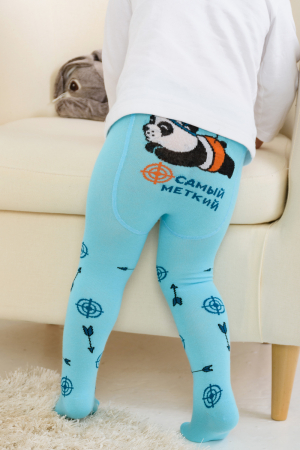 Детские колготки для мальчиков. По всей поверхности колготок вывязаны рисунки в виде стрел и мишеней, сзади - панда и надпись Самый меткий