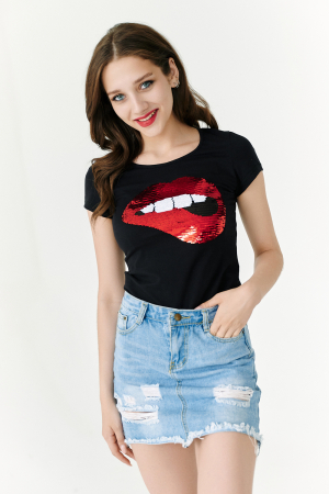 Футболка полуприлегающего силуэта, с округлой горловиной, длиной до середины бедра. Рукав втачной короткий. Горловина обработана бейкой из основного полотна.