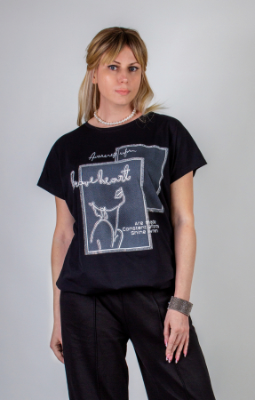 Крой футболки продуман до мелочей: опущенная линия плеча создают свободный, но элегантный силуэт, который легко адаптируется под любую фигуру. Футболка идеально садится благодаря продуманному крою, подчёркивая достоинства и скрывая возможные недостатки. Черный базовый цвет делает модель универсальной и легко сочетаемой с любыми аксессуарами и низом гардероба. Центральный элемент дизайна абстрактный принт из квадратов с изображением женского лица и выразительными надписями, обрамленный сверкающими стразами. Они добавляют праздничного блеска, подчеркивают художественный характер рисунка и ловят свет при каждом движении.