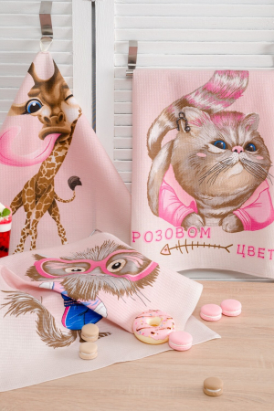 Набор из трех розовых полотенец с милыми зверями украсит вашу кухню и обеспечит заряд хорошим настроением. Полотенца отлично впитывают влагу, быстро сохнут и не боятся машинной стирки. Каждое из трех полотенец имеет уникальный рисунок. Для удобства использования к каждому полотенцу пришита петелька.