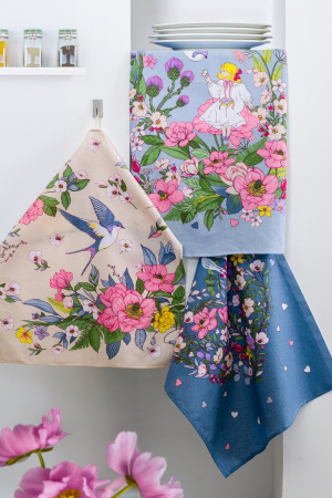 Дизайн полотенец выполнен в весеннем ярком стиле с изображением ласточек, цветов, в бежевом и синем цветах. Рогожка из 100% хлопка обеспечивает отличное впитывание и быстрое высыхание, делая полотенца идеальными для использования на кухне для посуды, рук и кухонных поверхностей.