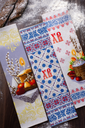 Набор из трех кухонных полотенец размером 60*48 см. Выполнены из прочного хлопчатобумажного полотна - рогожка. Отлично впитывают влагу, сохраняют цвет и форму после стирки. Каждое полотенце с индивидуальным рисунком, посвященным светлому празднику Пасхи. Порадуйте себя и своих близких приятным подарком на праздник.