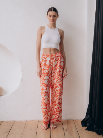 Брюки прямого свободного кроя имеют на талии мягкую эластичную широкую резинку.