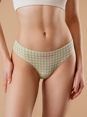 Женские трусы от торговой марки Индефини.  Трусы-стринги из хлопка, зеленого цвета с принтом, с кружевной частью сзади, на мягкой резинке, средней посадки.