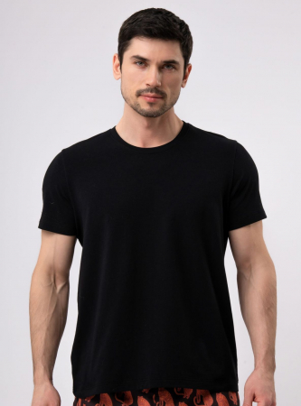 Мужская футболка классического черного цвета сшита из хлопка. Изделие сидит на теле аккуратно и естественно, а материал приятен к коже. Универсальная базовая модель для дома, работы и активного образа жизни.