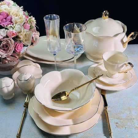 Коллекция МИРАЖ изготовлена из фарфора с глазурью цвета топленного молока. Изящная форма распустившегося цветка и отделка золотом, идеально смотрится в любом интерьере. Коллекция состоит из обеденного сервиза и предметов сервировки.