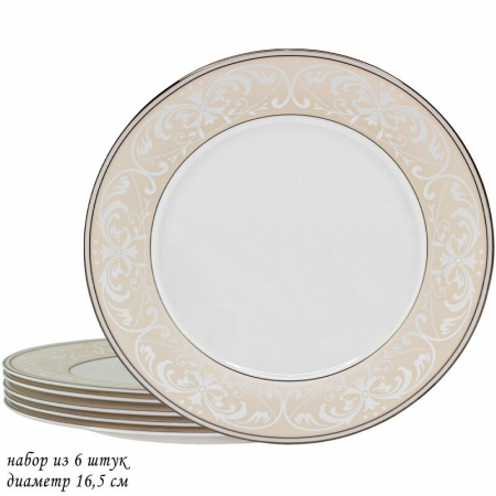 Коллекция Джульетта изготовлена из тончайшего костяного фарфора. Посуду отличает тонкая серебряная окантовка, борт нежно бежевого цвета с белыми объемными узорами.