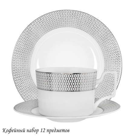 Коллекция СЕВИЛЬЯ СЕРЕБРО изготовлена из воздушного костяного фарфора. Декор выполнен в классическом серебряном рисунке в виде медовых сот. Коллекция состоит предметов сервировки, чайных и кофейных сервизов