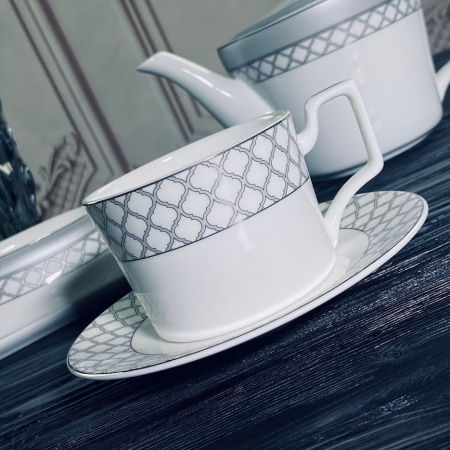 Изысканная коллекция ВЕРСАЛЬ изготовлена из полупрозрачного костяного фарфора. Изысканная палитра, сочетающая в себе нежные оттенки матового серого цвета и серебряного декора, очаровывает своей глубиной и игрой света. Изящный серебряный края, словно лунный свет, обрамляет тарелки. Утонченный рисунок из выполнен с искусной точностью. Коллекция состоит из предметов сервировка, обеденных, чайных и кофейных сервизов.