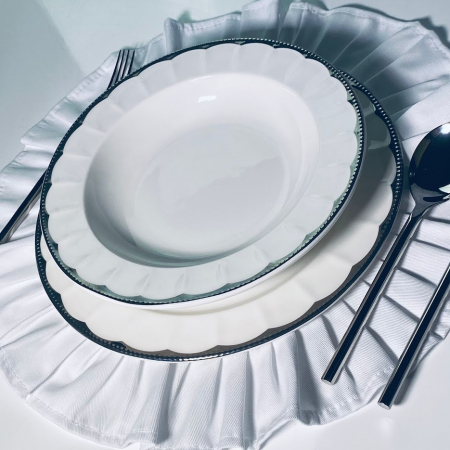 Изысканная коллекция посуды из фарфора ИМПЕРИАЛ , выполнена в классическом дизайне, с глазурью белого цвета. Серебрянный декор,волна на ободке придают легкости и оригинальности. Коллекция представлена сервизами, отдельными предметами, чайными наборами и сервизами.