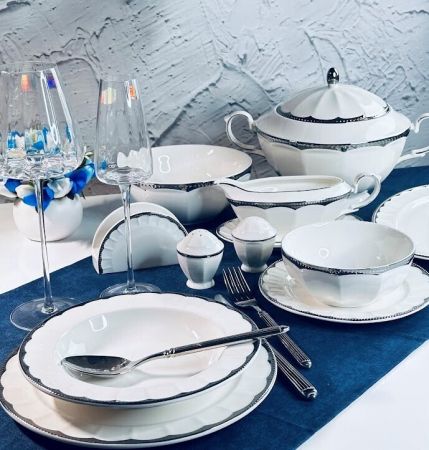 Изысканная коллекция посуды из фарфора ИМПЕРИАЛ , выполнена в классическом дизайне, с глазурью белого цвета. Серебрянный декор,волна на ободке придают легкости и оригинальности. Коллекция представлена сервизами, отдельными предметами, чайными наборами и сервизами.