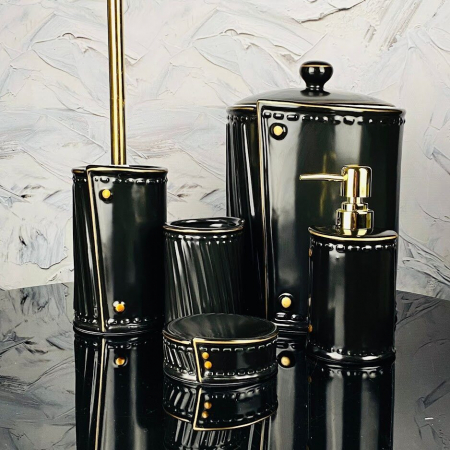 Набор аксессуаров для ванной комнаты состоит из пяти предметов: мыльница, дозатор для жидкого мыла, стакан зубных щеток, ершик для унитаза со стаканом, емкость для мелкого мусора. Набор выполнен из высококачественного фарфора с рельефными рисунками.